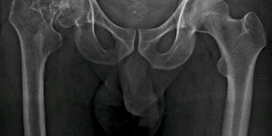 Paciente de 43 años, con fractura patológica de cadera derecha. RMN mostró afectación de femur proximal, por lo que se realizó una artroplastía total de cadera con tallo no convencional.